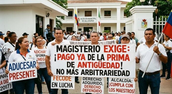 Una masiva protesta de docentes en Valledupar sacudió la Alcaldía Municipal este lunes 13 de abril. Decenas de educadores y directivos exigieron el pago de la prima de antigüedad, un derecho laboral que la administración les arrebató de manera arbitraria en 2017.»La movilización denuncia un atropello que completa casi una década sin solución. La protesta, respaldada por organizaciones sindicales del sector educativo, se convirtió en una nueva señal del desgaste que existe entre los maestros y la administración local por una deuda que sigue sin resolverse.